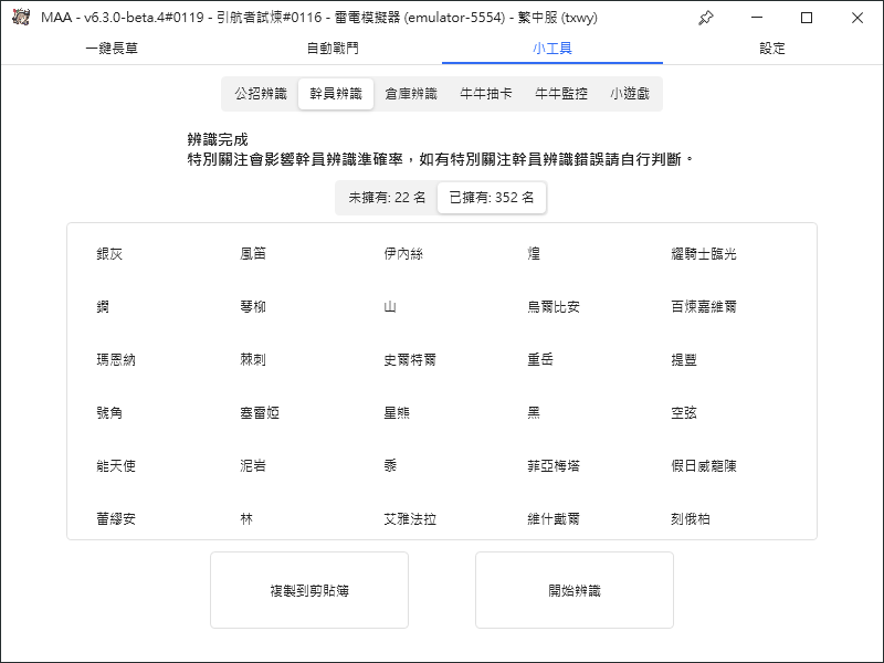 (你的這個高資回費出的是推進之王呢還是推進之王呢) - 支援辨識幹員列表,統計已有和未有幹員及潛能,並在公招辨識顯示