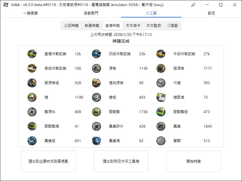 - 支援辨識養成材料,並匯出至 企鵝物流刷圖規劃、明日方舟工具箱、ARK-NIGHTS 幹員培養表